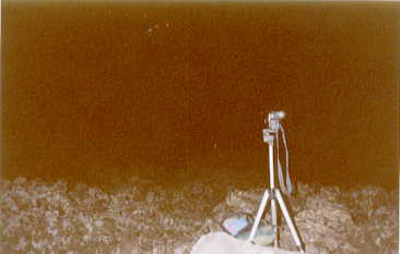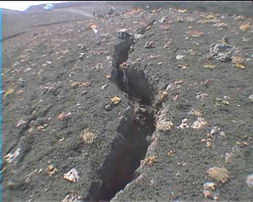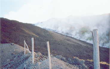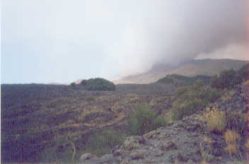 8. Tag - Freitag, der 27.07.2001 Gegen 2 Uhr bemerkten wir auch eine Veränderung der Aktivität. Meist hatte der hauptaktive Krater/Schlot mit seinen bis zu 400 Meter hohen Feuerzungen die Kulisse bestimmt. Recht daneben kochte ein weiterer Schlot ein kleineres, aber sehr beständiges Süppchen. Links vor der erkennbaren Aufschüttung des Hauptauswurfes jedoch war ein weiterer Schlot, der sehr unterschiedlich tätig war. Meist mischte er mit hohen Fontainen mit, jedoch bildete er regelmäßig Gasblasen, die unter erheblichem Knall, riesige Lavafetzen wie eine Kugel weit von sich schleuderte. Wir schätzen die Wurfweite auf gut 500 Meter ein, da der Montignola locker überworfen wurde. Den Knall verglichen wir mit einem Blitzeinschlag in ca. 500 Meter Entfernung. Auch rechts hinter dem Montagniola erschied regelmäßig das Leuchten eines aktiven Lavaschlotes der in größerem Abstand auch gigantische Explosionen verursachte, die weitere Lavabrocken weit über den Grat des Montignola warfen und damit auch für uns sichtbar machten. Gegen 4 Uhr machte sich vor der 3er-Kombination ein weiterer Krater bemerkbar, der etwa 1 Stunde lang heftige Ascheeruptionen hatte. Der Lavastrom zwischen dem Hauptkrater und unserer Position war derweil unseren Augen ins Tal hin entschwunden, verbreiterte sich aber oben weiterhin sichtlich. Wegen der Kälte waren wir eng zusammengerückt, so dass es zumindest für eine kurze Zeit auszuhalten war. Dazu kamen die harten und absolut scharfen Lavabrocken als Lager, während der Berg oben ständig laute Explosionen verursachte. Aber wir hatten uns schon so daran gewöhnt, da sich zudem der Blick nach Eingang des Knalles auch nicht mehr lohnte, da das Schauspiel ja schon gut 5 Sekunden zurück lag und nach der hier schon verbrachten Zeit nichts Neues versprach. Nach dem Sonnenaufgang machten wir uns dann quer über das Lavafeld Richtung Skipiste auf, da wir noch ein Stück Pistenstrasse erkennen konnten. Hier holte ich mit auch wieder eine schöne Schramme, die sogar einen meiner Sie beiden Strümpfe aufriss, blieb jedoch von Dehnungen, Brüchen oder so weiter verschont.