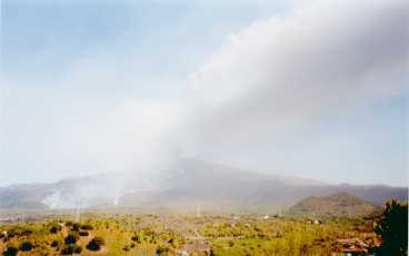 2. Tag - Samstag, der 21.07.2001 Ich erwachte von einem Regenguss. Nicht nur das die Regentropfen hart auf das Zelt klopften musste ich zudem auch dringendst zu den Toiletten. Ich hatte jedoch Glück und kam recht trocken davon. Wieder eingeschlafen wurde ich mit dem Tageslicht wach. Da ich noch viel vor mir hatte, nahm ich mir vor erst auf der Fähre bzw. davor in der Warteschlange zu frühstücken. So hatte ich hurtig das schon wieder trockene Zelt abgebaut und im Auto verstaut. 5 Minuten später kamen auch die Angestellten. Die 17.000 Lire hielt ich angesichts der miserablen Sanitäranlagen für überteuert, aber ich hatte sonst nicht viel von der Anlage gesehen, um besser beurteilen zu können, welcher Service da inbegriffen sein könnte. Die wegen dem sehr starken Wind hohe Dünung war gut zu hören und im Campingplatz gab es einige Mücken. Schattenspendende Bäume und die grünen Bastplanen über allen Plätzen waren neben dem Sandstrand sicher ein gutes Ambiente. Die letzten 100 Kilometer zur Fähre vergingen im Flug und an der Verladestation angekommen, konnte ich nach dem Ticketkauf auch sofort auf die erste Fähre. Diesmal musste ich nur 56.000 Lire zahlen, was gegen den Vorjahren ca. 5.000 Lire weniger waren. Wegen meinem Schwert vom Surfbrett konnte ich aber nicht in das normale Parkdeck und musste auf der Freifläche stehen bleiben. In Messina wusste ich zwar wohin ich fahren musste, auch wenn einige Baustellen die Orientierung wieder aufs neue auf die Probe stellten. Schnell hatte ich mich auch an die sizilianische Fahrweise gewöhnt, so dass ich bald auf der Autobahn Richtung Catania war. Nach der Mautstation (5.000 Lire) kurz vor Taormina konnte ich den Ätna sehen. Rauchschwaden umhüllten die gesamte Ostseite und der Wind trieb einen schwarzen Schleier davon. Dieser war etwa 5 Kilometer breit und verbreitete auf der Fahrt einen dunklen Schatten wie von einer Gewitterwolke. Und wieder hatte ich die falsche Ausfahrt der Autobahn bei Giovanne genommen. Doch schnell war die Strasse von Catania nach Nicolosi gefunden und auch Mascalucia erreicht. Ich erwartete immer wieder Straßensperren wegen dem Ätna, aber ich erreichte Nicolosi, als wäre alles wie sonst auch. Hier kaufte ich erst noch Essen im Supermarkt ein, so dass ich für den Rest des Tages Erholung finden konnte. Auf dem Weg zum Campingplatz konnte ich schon die Rauchsäulen sehen, die vom Ätna immer wieder hoch in den Himmel geschossen wurden.