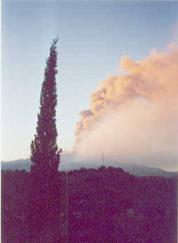 (Foto mit freundlicher Genehmigung von NOAA) Das Spiel endete frühzeitig zum Sonnenuntergang, da die untergehende Sonne die Aschewolken in einem gelblichen Licht erschienen ließen. Das wurde schnell durch ein Foto von der erhöhten Stelle des Platzes dokumentiert. Nach dem Abendessen packte ich die Video- und Fotoausrüstung zusammen und ging wieder zu der Aussichtstelle auf dem Monte Rossi. Nachdem die letzten Reste des Tages am Horizont verschwunden waren, kam der Berg wieder so richtig zur Geltung. Die Aschewolken verschwanden in der Dunkelheit während die Lavaeruptionen jetzt deutlich zu sehen waren. Auch der gesamte Weg der Lava bis hier herunter ca. 4 Kilometer vor Nicolosi wurden durch eine rot glühende Bahn deutlich gekennzeichnet. Vereinzelt etwas hellere Flecken deuten auf noch aktive Ströme hin, die sich wie eine Perlenschnur den Bergrücken herunter zogen. Nach ca. 1 Stunde beendete ich auch diesen Ausflug wieder und ging zum Platz zurück. Gleich rechts neben dem Eingang entdeckte ich ein deutsches Fahrzeug. Auch die drei hatten sich bisher nur bis an das Lavaende hier vor Nicolosi vorarbeiten können. Die Sperrungen der Polizei wurden immer besser und dichter. Aber der Ehemann war an einer Nachttour rechts der Lava für Aufnahmen interessiert. Mal sehen ... Zurück entdeckte ich noch 2 Deutsche (Mark und Daniela), die sich als wahre Fachleute herausstellten. Neben den historischen Daten des Ätna, sowie den dazugehörenden Fachbegriffen und der Lage oben kannten sie auch viele der von mir vor dem Urlaub besuchten Internetseiten. Scheinbar hatte ich auch deren Seiten gesehen, den sie besaßen neben http://www.fernewelten.de/ und http://www.vulkane.net/ (hier empfehle ich einen Spaziergang durch deren Aufnahmen und Erklärungen - super Fotos!) weitere Adressen, die sich mit Vulkanen und Reisen beschäftigten. Später bestätigten sie mir, dass das ihr Beruf sei. Die beiden waren wohl auch die gesuchten Personen, nach denen mich am Vortag der Polizist befragt hatte. Sie hatten sich genau in dem besagten Gebiet aufgehalten. Zudem kannten Sie schon die Position, die ich noch zu erreichen hoffte. Die Position sollte wirklich beeindruckend sein, da der Blick genau in den Krater reichte. Die beiden jedoch wollten auf den Montignola hinauf, um Aufnahmen von den Ascheausbrüchen zu machen. Sie hatten auch die in den Nachrichten gezeigten Risse im gesamten Berg gesehen, so dass ich weiterhin keine Bedarf hatte, auf den aktiven Berg selbst zu gehen. Nach vielen Details auf diversen Karten kam ich erst kurz vor ein Uhr ins Bett. Ein Highlight war ein totaler Stromausfall auf dem Campingplatz, der für 1 Minute endlich mal für absolute Dunkelheit und Ruhe sorgte. 5. Tag - Dienstag, der 24.07.2001 Keine Störung und trotzdem war ich um ca. 7 Uhr auf den Beinen. Toilette und erst einmal ein genüsslicher Blick auf den Berg. Die Geräusche hatte ich gleich nach dem Erwachen wieder vernommen, und auch die Sichtprüfung zeigte keine Veränderungen. So wurde es ein gemütliches Frühstück, während die beiden Deutschen schon im Aufbruch waren. Sie hatten ja noch viel vor. So fuhr ich zum Einkauf und hoffte, die Stadt würde nicht zu voller Vulkantouristen sein. Es wirkte jedoch alles recht normal. Auch die Eislaufbahn hatte eine feste Halle mit einer Kuppel erhalten. Nur die überall liegende schwarze Masse deutete auf den Ausbruch hin. Auch viel mir auf, das viele Personen nach dem Verlassen der Gebäude erst einmal den Blick zur Aschewolke erhoben. Mehr war in den Gassen auch nicht zu erkennen. Direkt am Supermarkt traf ich auch noch einmal die beiden Deutschen (Marc und Daniela) wieder. Brot, Wasser, Bananen, Milch und Yoghurt für 4 Tage sollten als Einkauf ausreichen. Schon auf dem Hinweg war mir aufgefallen, dass die Polizei jetzt direkt oberhalb der Einfahrt zum Vulkan die Strasse gesperrt hatte. Auch wir Campingnutzer wurden schon auf die unteren Strasse geleitet. Meine Suche nach einem kürzeren Weg für die Nacht, der begehbar sein würde, wurde also schon im Ansatz zerstört. So musste ich mich dann wohl auf meine bisherigen Ortskenntnisse verlassen. Die Zwickauer jedoch hatten einen Weg gefunden, der scheinbar unweit meiner letztens genutzten Position sein musste. Also vereinbarten wir gemeinsam zu starten, wobei wir vor hatten, von dort aus schnell wieder auf die Strasse zu kommen, und dann immer bei herannahenden Fahrzeugen über die Fahrbahnbegrenzung außerhalb deren Sichtbereich zu flüchten, da wir die Lichtkegel frühzeitig erkennen konnten. Um 19 Uhr ging es dann los. Wie angenommen führte uns ihr gefundener Weg nahe an meine Position heran und sogar darüber hinaus. Zusätzlich überwand deren Geländewagen noch gut 2 Kilometer Schotterpiste, vor der ich mit meinem 5er hätte kapitulieren müssen. Von dort aus nahmen wir den nicht mehr befahrbaren Weg und einen anschließenden Wanderpfad bis an ein Lavafeld. Leider waren wir aber jetzt schon weitab meiner genutzten Route und auf gut Glück angewiesen. Das Lavafeld (Moosbewachsen) ist zwar begehbar, jedoch fanden wir uns dort immer schlecht zurecht, so dass das Vorankommen nicht sichtbar wurde. Kurz vor der hereinbrechenden Dunkelheit erreichten wir einen Schotterweg, von dem ich zudem annahm, dass er genau an der Strasse oben unterhalb eines Waldstücken mit einem Tor enden würde. Da der Weg abwärts nicht sicher weiterführen würde, gingen wir weiter bergauf, um dann die Strasse nie mehr zu verlassen. Die Mutter war schon völlig fertig und hatte an einer weiteren Lavadurchquerung verständlicherweise kein Interesse mehr. Aber ich vertraute ihrem Mann, der ihre Durchhaltefähigkeit besser beurteilen konnte. Der Weg war mir dann wirklich bekannt und ich konnte sogar meine Fußspuren von der ersten Wanderung und andere Einzelheiten erkennen und vorhersagen. So erreichten wir das Tor. Von hier aus war jedoch nichts von der Pracht eines Vulkans zu erkennen, so dass wir weiter noch oben mussten. Ich schätzte die not
