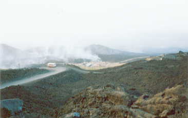 (Foto mit freundlicher Genehmigung von Roberto Clocchiatti) Die Videoaufnahmen waren schon von der Aufnahme her ein Genuss. Der ständige Lärm zerrte anfangs mehr an meinen Nerven, doch fast an der Station angekommen, aß ich sogar mit dem Rücken zum Schlot sitzend und genoss die Aussicht ins Tal mit dem überall dampfenden Lavastrom, den ich jetzt von hier oben wieder gut erkennen konnte. Jetzt ging ich in die Schlussoffensive, da ich hier keine Deckung mehr hatte. Aber hier oben auf den beiden alten Kratern konnten die mich eh nicht mehr einholen. Zudem lief ich eher schon wieder zurück und wurde auch nicht weiter belästigt. Noch ein paar Aufnahmen gemacht und die Situation auf der Station in 2000m Höhe erfasst. Die Lava hatte sich das kleine Haus, was an dem Superior stand, mitgenommen. Dahinter war ein Wall aus Asche und Geröll errichtet worden, um das erste Gasthaus von Zaffarena aus gesehen, zu schützen. Hinter der Lava war der Rest der Station samt Gondel, die bisher viel Glück gehabt hatten, da doch der Krater fast genau oberhalb aufgebrochen war. Doch von weiter oben näherte sich ein weiterer Lavastrom. In seinem angenommenen Verlauf wurde mit mehreren Maschinen gearbeitet. Die hochziehenden Rauchschwaden des Lavasromes verhinderten aber genauere Beobachtungen. Aber ich konnte feststellen, dass noch viel dort oben um die Station und die Vulcanologenbunker los war. Jetzt ging ich an den beiden Kratern entlang Richtung Strasse, kürzte aber vorher wieder rechts hinunter ab, so dass ich ganz offen von dem Krater weg ging. Hier hatte ich aber noch mal die beste Aussicht aus etwa 400 Meter Entfernung. Dann begann ich mit einem schnellen Abstieg, nahm aber die Strasse, so oft ich konnte. Hier wurde ich auch von der Polizei aufgegriffen, die mich trotz Abstieg anhielten. Er wollte aber nur Wissen, ob ich zu den zweien gehörte, die ganz oben am Ascheschlot gesehen worden waren. Ich erklärte anhand meiner Karte meinen bisherigen Weg, erntete ein verschmitztes Lächeln und konnte weiter gehen. Der Rückweg war zwar mit 2 Stunden gegenüber den 6 Stunden Aufstieg wesentlich schneller, aber auch keineswegs leichter. Erkaltete Laveströme sind unwahrscheinlich schwer zu gehen. Ich fand aber erstaunlich gut fast genau den Hinweg zurück und auch das Auto unverändert vor. Nur die Spuren in der Asche zeugten davon, dass viele Autofahrer diese Sackgasse gefunden hatten. Auch als ich einstieg, näherte sich schon der nächste Suchende. Zurück wurde ich jetzt an einer Kreuzung angehalten, die am Morgen noch unbewacht war. Da ich noch keine Passierkarte für den Campingplatz hatte, musste ich alle Künste aufwenden, um durchzukommen. Zurück am Campingplatz holte ich mir sogleich diesen Passierschein, da ich ja noch öfters in die Stadt müsste. Zurück ging ich noch schnell in den Pool eine Runde Schwimmen, so dass ich gut abgeduscht die Sachen wegräumen konnte. Zudem gab es auch Volleyball, doch für heute war ich mit Bewegung und so weiter sehr gut bedient. Dann kochte ich mir Ravioli, während am Swimmingpool schon alles für die Abenddisco vorbereitet wurde. Weiterhin hörten wir hier die Explosionen des Ätna, an die ich mich aber schon gewöhnt hatte. Ich musste feststellen, das fast alle Italiener rauchten. Selbst wenn sie ihre Kinder versorgten, oder ein Fahrrad reparierten. Der Glimmstengel wurde nicht weggelegt. Trotz der immer sehr lauten Musik war ich auch heute wieder bald eingeschlafen. 4. Tag - Montag, der 23.07.2001 Leider wurde ich wieder von der üblichen Frührunde des Helikopters geweckt, der genau auf dem Sportgelände gegenüber seine Station hatte. So nutzte ich die allmorgendliche Störung für das eigene Wohlbefinden und legte mich wieder etwas hin. Aber nicht all zu lange danach wachte auch der gesamt Campingplatz auf und der übliche Geschirr und Kinderlärm erfüllte unseren Pinienwald. So frühstückte ich gemütlichst, nicht ohne immer wieder in der Nähe der Toiletten einen Blick zum Ätna zu wagen.