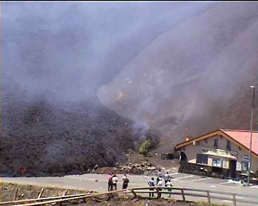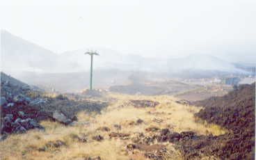 Kurz vor der Serpienza mussten wir wieder über Lavafelder und Geröll, da die Baumaschinen mehrere Wälle zum Schutz der Gebäude errichtet hatten, die immer quer talwärts angelegt waren. Neben Reportern und vielen Arbeitskräften waren die Gendarmarie und das Militär sogar mit eigenem Arbeitsgerät vor Ort. Hastig wurden noch weitere Wälle gegen die wachsende Flut aus Lava geschoben. Die Lava war nur wenige Meter von der Station mit seiner Liftanlage und den kleinen Verkaufsständen aus Holz vorbei geflossen, und weitere Schaulustige mit Passierschein staunten von der mir gut bekannten Treppe zur Gondelstation aus auf die schwarzen, gefährlichen und Hitze ausstrahlenden Massen.