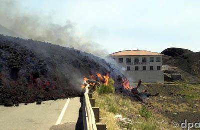 Wegen dem nahenden Lavastrom war die zur Station führende Strasse schon an der Kreuzung nach Belpasso gesperrt. Aber von da aus konnte in ca. 10 Minuten Fußweg der herannahende Lavawall erreicht werden.