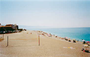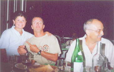 Zum Mittagessen, JackomoŽs Frau stürzte sogleich zu mir rüber, gab es diesmal Spaghetti + Zuchiniringe und Nudelsuppe mit Spinateinlage (?), also von meinen hinteren Nachbarn aus Palermo. Danach genoß ich wieder die Mittagsruhe bis 16.30 Uhr, die ich auch meist durchschlafen konnte. Ich verfolgte aber immer mit Interesse einen kleinen Jungen (so etwa 5), der mit seinem Fahrrad + Seitenstützen die Strasse um unsere Parzellen abfuhr. Ich hörte ihn immer schon auf gut 100 Meter, da sein Fahrrad furchtbar quitschte. Jedoch habe ich auf eine Serviceleistung Schmierung verzichtet, weil ich den Kerl nicht erschrecken wollte. Mich amüsierte jedoch der Gegensatz von Ruhe und sein Fahrradgequitsche... Zur Gymnastik und Tanz, anschließend wieder Kraftausdauer Duschen, getippt - gestört - Mädchen kamen - haben im Wörterbuchteil des MarcoPolo über Sizilien geblättert und viel gelacht, Dann noch zum Volleyball an den Strand mitgegangen, lustig und schwimmen, Obst von Palermonachbarn da - was ist das? Dabei Einladung für Sonntag, aber leider schon vergeben, Abendessen gegenüber ?, Unterhaltung, Show verpasst, aber die Musik mit der Einstudierung von Nachmittag erkannt, gegen 23.30 noch zur Disco, aber nur noch normal, kurz an den Strand und ins Bett, 16. Tag - Samstag, der 04.08.2001