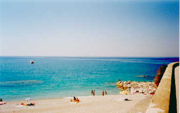 (Calanovella -Siehe Beschreibung- ) Also rein, nachdem ich bis 16.00 Uhr zur Toröffnung etwa 5 Minuten warten musste und flott das Zelt aufgestellt. Den Platz hatte ich gewählt, da ich das Surfbrett immer selber zum Strand tragen musste und so zu beiden Zugängen einen kurzen Weg hatte. Zudem bot dieser Platz einen guten Überblick über die anderen Gäste, denn ich wollte die Gäste hier schon etwas genauer betrachten. Dann bin ich ins nahe Meer, was überraschend warm war. Nicht so salzig wie angenommen, konnte ich es gut aushalten. Klar und sauber und sogar die Fische blieben bis etwa 20 cm Abstand, so dass sogar dass kurze einfache Tauchen zum Erlebnis wurde. Grosse Felsbrocken hielten sicher die auch auftretenden Wellen vom Strand fern. Nur zum Surfen schien mir das nicht gerade geeignet. Nach dem Salzbad wollte ich noch in den Pool, aber dort musste ich eine Karte vorzeigen, was mir an der Rezeption nicht so (falsch verstanden?) angezeigt wurde. Mist - wütend war ich schon, den im Chlorwasser ist das Schwimmen schon noch etwas anderes und nimmt mir auch den Salzgeschmack weg. Zumindest sollte eine Karte für 15-fachen Eintritt 3.000 Lire kosten, aber Badehaube war vorgeschrieben. Bei meinen Haaren sehe ich das zudem nicht ein, also verzichtete ich vorerst auf dem Kauf. So ging ich zurück und machte mich zu einem Lauf fertig, so dass ich den an sich bewegungslosen Tag noch mit etwas mit Sport würzen wollte. Erst an den Strand, und auf zur nahen Ortschaft, dort dann hin und her, hinauf und herunter, so dass ich schnell einen Eindruck von der Siedlung hatte. Da aber Sonntag war, konnte ich viele Geschäfte sicher gar nicht erkennen, da viele Eingänge und Fenster mit schweren Rollos verschlossen waren. Kriegerdenkmal, Kirchen (halb zerfallene Türme, die Glocken hielten wohl gerade noch so), Pizzerien, kleine Läden und schöne Zentralplätze. Im Ort baute man auch für ein größeres Ereignis eine Bühne mit Sound und Lichtanlage auf. Wieder am Strand zurück zum Campingplatz, war ich dann 40 Minuten unterwegs gewesen.