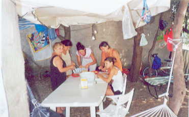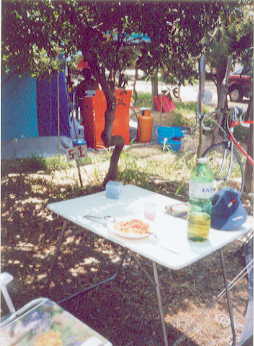 So kehrte ich an meinen Platz zurück und konnte Abendessen. Wieder wurde Milch, Joghurt, Müsli und Banane verschlungen. Meine Nachbarn aus Palermo (Jackomo) hatten mir Postkarten aus Palermo mitgebracht. 10 Minuten vorher ging ich zur Verabredung, und setzte mich noch abseits der Parzelle hin und sah der Familie bei den Vorbereitungen zu. Dann kehrte ich zurück um noch Block und Stift zu holen, da ich mir die Namen notieren konnte, da es immer gleich gut 10 waren, und das konnte ich mir nicht merken, wollte aber bei der nächsten Begegnung zumindest die wichtigsten parat haben. Da aber wurde ich schon von Roberta, der ca. 13 jährigen Tochter meiner rechten Nachbarn abgefangen, ich sollte unbedingt die Pizza probieren. Da auch Guisy und Isabella anwesend waren, konnte ich nicht aus und durfte noch einen Becher Cola genießen. Danach ging es dann aber hurtig wieder zurück zur Verabredung.