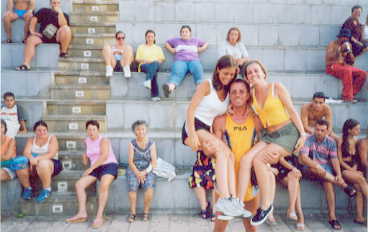 Erst um halb Sechs wurde ich wieder wach und beeilte mich noch schnell einen Imbiss zu mir zu nehmen und die Sachen für die Gymnastik usw. zu packen. So baute ich meine Kamera auf der Tribüne auf und machte ein paar Aufnahmen von unseren Übungen. Der anschließende "Tropical Dance" war wieder lustig, weil auch Claudio, der Tänzer der Animationstruppe, immer wieder mal aus dem Tritt kam. Schon beim Tanz war dieses hübsche und absolut biegsame Mädchen wieder da, und beim jetzt folgenden "Kraftausdauertraining?" waren wir ein Paar für die Übungen. Wir mussten viel lachen, so dass sich danach eine nette Unterhaltung entwickelte. Die Familie fand mich "Sympatico", so dass wir noch œ Stunde dort verblieben. Ein Paar Namen (Florentina - Flora) und - wieder 15 Jahre. Ich sollte unbedingt zum Abendessen (Kuchen) kommen, da die Tochter ihren 4 Geburtstag feiern würde.