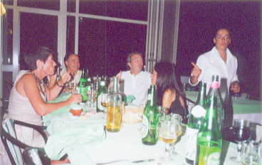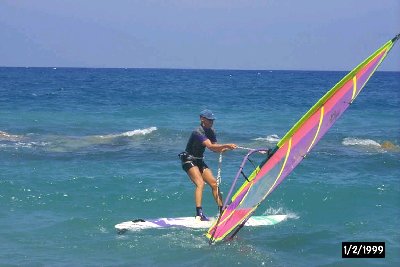Nochmal zum Meer, konnte jetzt aber Felsen besteigen, Antonietta meinte "Pezzo!", geholfen, Moräne zu zerlegen - die Hände rochen noch ewig nach Fisch. Guisy hatte Verletzung am Fuss - verarztet (Salbe); Abendessen Neapolitano, Massage Chesere - ist immer lustig, jetzt wollten Guisy und Isabella unbedingt auch als nächstes dran sein ... tststs; Keine Disco mehr Strand mit Anna-Maria und Giusy, Bett 21. Tag- Donnerstag, der 09.08.2001 Ich hatte gut ausgeschlafen. Seltsamerweise war ich hier recht müde, so dass ich ohne weiteres bis gegen 9 oder 10 schlafen konnte. Das Frühstück bestand wieder aus œ Ltr Milch, 2 Joghurt, 2 Bananen und Müsli. Das sollte wieder eine Zeitlang anhalten. So ging ich gegen 10.30 Uhr mit dem Surfbrett an den Strand und holte auch das Segel, den zum Segelwendeüben war der Wind ausreichend und die Wellen wieder unproblematisch. So war ich anfangs bei Nordwestwind draußen, kam aber gerade noch vor der Flaute zum Strand zurück. Doch dann kam Nordostwind auf, der sich gut entwickelte. So ging ich wieder raus und hatte diesmal eine super Fahrt. Ich konnte den Wind gut 1 Stunde ausnutzen und hing teilweise gut im Trapez. So machte Windsurfen spaß.