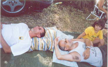 23. Tag - Samstag, der 11.08.2001 Gegen 10 Uhr trieb mich die Hitze und der Schweiß aus dem Zelt. Noch bevor ich den Wagen holen konnte, gab es schon einen Kaffee gegenüber. Doch auf das Frühstück musste ich verzichten, hatte ich doch noch 4 Joghurt im ungekühlten Wagen. Der glühte auch schon unter der Sonne als ich ihn abholte. Das Animationsteam war auch schon wieder mit der Begrüßung der Gäste am Eingang beschäftigt. Ein Blick auf Meer hinaus lies mich in Eile geraten, hatte doch der Wind gut die Stärke von vor 2 Tagen übertroffen und das wollte ich nicht versäumen. Das übliche Frühstück, Sanitäranlagen aufgesucht und dann gleich mit dem Brett und Segel an den Strand. Der Start warnte mich sogleich vor, löste sich doch der Mast gleich bei der ersten Welle aus der Halterung. Die Wellen gerade am Strand warfen das Brett heftig zurück, so dass ich schon jetzt gut zu tun hatte. Trotzdem klappte der Strandstart und ich konnte trocken losfahren. Der Wind war gut, jedoch wieder recht ungleichmäßig, aber die Wellen machten mir zu schaffen. Sie waren etwa 60-80 cm hoch und ich hatte immer die Bedenken, dass sich wieder der Mast aus der Halterung lösen würde. So waren meine Halsen recht umständlich, wollte ich doch ein wieder Zusammenstecken bei dem Wellengang unbedingt vermeiden. Nach 25 Minuten gab ich auf und führ an den Strand, den ich aber trotz Wellen gut und ohne Probleme erreichte. So brachte ich das Surfzeug an den Platz zurück und schwamm noch um die Felsbarrieren herum. Zurück wurde es sehr lustig. Chesere hatte sich leicht am Fuß verletzt und wollte auch so von mir verarztet werden wie Giusy. So holte ich das Verbandszeug und wir bereiteten eine große Operation vor. Ich hatte einen Atemschutz und Kopfbedeckung sowie Handschuhe und eine Assistentin und der Patient einen Beißring gegen die Schmerzen. Antonietta konnte vor lachen fast nicht mehr atmen. Danach lag ich noch geduscht etwas auf der Matte herum, bevor es wieder zum Essen zu "NapolitanoŽs" ging. Dann konnte ich den dringend benötigten Mittagsschlaf antreten. = = =Schwimmen - duschen - Volleyball mit Anna-Maria und Giusy, Wasserduell mit Kind und Claudios Auto (2), etwas laufen (Knie), der Typ Wasserduell mit Giusy/Anna-Maria und wieder duschen, Roberta und Bruder Laptop, Eltern wieder da noch mal das ganze, Isabella, Pane/Tomaten von rechts, und gemeinsames Essen bei NapolitanoŽs, durch Unterhaltung etwas später geworden (Landkarten Europa) und vergessen, dass am Samstag das gemeinsame Tanzen früher los geht, nicht mehr ins Theater gegangen; 24. Tag - Sonntag, der 12.08.2001