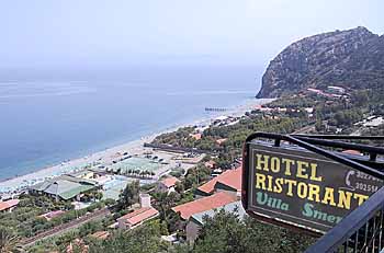 Nach der Rückkehr machte ich mich Fertig um der Einladung von NapolitanoŽs zum Abendessen zu folgen. Isabella hatte das Essen wieder in ihrer besonderen Art dargestellt. Große Augen und freche Lippen luden mich zu "Saussischa" (Grill-Würste) ein. Da konnte ich wirklich nicht mehr wiederstehen. So schnappte ich mir meinen Klappstuhl und machte mich auf zur anderen Straßenseite. Der Grill war schon länger in Betrieb und ich fand trotz des Durcheinanders am Tisch irgendwie den mir vorgesehenen Platz. Die Würste waren mir nicht völlig unbekannt und schmeckten ausgezeichnet, auch wenn sie nur so von Fett strotzten.Dazu gab es reichlich Brot, Salat, Wein und Nusslikör. Dies fanden wir erst mit Hilfe des Sprachführers in meinem "Marco Polo Sizilienbuch" heraus. So fingen Isabella und Giusy an, auch die Zahlen von 1 - 10 zu erlernen, da ich schon bei 20 angekommen war. Besonders die Laute "ä, ü und ö" machten ihnen immer wieder zu schaffen. Aber wenn Isabella die "fünf" aussprach, wurde mir ich immer sehr warm. Dieser Mund und das Gesicht dazu - da musste ich schnell weggucken, denn das war zuviel für mich ... So wurde ich noch für den kommenden Sonntag zum Essen eingeladen, wobei ich oft nicht sicher war, ob ich das auch richtig verstanden hatte. Wegen dem gemütlichen Essen und der Unterhaltung verpasste ich die Show und den Tanz, und hatte im Gegensatz zu den Mädchen auch kein Interesse mehr, mich jetzt noch fertig zu machen und ins Theater zu gehen. Denn gerade die Zeit nach dem Tanz war immer sehr schwer, da ich nicht auf die anderen Gäste zuging und so auf die wenigen Bekannten angewiesen war, die mich einluden. So unterhielt ich mich noch mit den Eltern und hatte auch bald ausreichend Wein genossen. Gegen Mitternacht ging ich noch für eine halbe Stunde an den Strand und lauschte der Stille, den Wellen und den Gruppen der jungendlichen Gäste rundherum. Dann war auch ich bereit, zu Bett zu gehen und den notwendigen Schlaf einzuholen. 15. Tag - Freitag, der 03.08.2001 Der Morgen brach heute früher an als sonst, denn der Wecker hatte mich nach 6 Uhr aus dem Schlaf gerissen. So verlief das Frühstück zwar wie üblich, jedoch früher als sonst. So startete ich um 7.30 Uhr mit meinem Fahrrad Richtung Capo de Orlando. Die Fahrt war angenehm, auch wenn ich ja erst einmal zur Küstenstraße hoch musste. Dann aber verlief die Strecke wunderschön an der Küste und oben in den Felsen am bekannten Turm entlang und bis Torrevilla. Dort hatte ich 25 Kilometer erreicht und wollte umkehren, da ich 50 Km als Tagessoll für ausreichend hielt. Zurück wollte ich jedoch eine Straße finden, die näher an der Küste verlaufen würde und nicht so viel Verkehr hätte. Zumindest hier im Deltabereich hatte ich eine solche Möglichkeit erwartet und fuhr einfach Richtung Meer um dann sozusagen im Trial and Error-Verfahren weiter zu kommen. Doch errreichte ich bald eine Sackgasse und die einzige Straße führte wieder auf die große 113 zurück. Nun denn, dann sollte es halt so sein und ich fuhr so die gleiche Route wieder zurück. Trotzdem war die Fahrt sehr angenehm und auch sehr Übersichtlich. Zurück am Campingplatz war schon der Kaffee auf meinem Tisch und ich machte mir noch eine kleine Brotzeit fertig. Danach bin ich schnell an den Strand. Das Surfen endete bald wieder am Strand, weil die Wellen und der Wind einfach nicht zusammenpasten. Entweder war der Wind (meiner Meinung nach) ausreichend, aber die Wellen dann schon unangenehm hoch, oder die Wellen waren zu ignoriren, aber der Wind viel zu schwach und unstet. So machte ich anschließend wieder Trockenübungen, zu denen ich auch Gavino und Chesere einlud. So erhielten auch die beiden einen Einblick in die Kräfte, die der Wind so auf das Segel ausübte. Daraufhin war ich noch Schwimmen, was ich durch die Runden um und zwischen den Felsen immer lange interessant gestallten konnte, wollte ich doch nicht völlig aus der Übung kommen. Auch das Besteigen eines der Felsen führte ich immer weider durch, um die Chance auf einen Startsprung oder einen Salto zu nutzen.