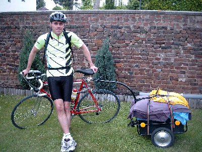 Ablauf: Fahrt in den Tälern entlang mit kürzeren und längeren Aufenthalten auf Camping, Besichtigung von Land und Leuten, sowie Sehenswürdigkeiten. Auch mal Ruhen am Ort oder am See, die Übernachtung auf Campingplätzen und Fahrtstrecken von bis zu 120 Km am Tag in maximal 5 Wochen Urlaub Training: tägliche Fahrt mit dem Fahrrad zur Arbeit (11 km einfach) Wochenendfahrten bis 100 km, und auch schon Fahrten mit Anhänger/Gepäck Probelauf des Komplettablauf (siehe oben) mit Radtraining am Starnberger See über 7 Wochen, teilw. mit Gepäck in die Berge Bisher erlebt: Rennrad und ein Anhänger! Ja, damit ich trotz Transport nicht auf das Radfahren am Urlaubsort verzichten müsste, denn die Umgebung meines Urlaubsgebietes möchte ich mir in kleinen Fahrten rund um eine Basis ansehen. Zudem denke ich ungern an die Speichenbrüche der Tour 1988 zurück, wo wir wegen des Gewichtes auf dem Fahrrad leicht an den Grenzen der Räder angelangt waren. Routenänderung: erste Idee war Mit dem Zug von Köln nach Genua/Italien (14 h), von dort mit dem Fahrrad und Anhänger an der Mittelmeerküste entlang über Pisa, Rom nach Neapel mit kleinen Abstechern in die Toskana (Vulkanseen, etc) bis Neapel (1500-2000 km) und von dort mit dem Zug zurück nach Köln (18 h) (grobe Kosten bei: 400 Euro Bahn, + tagliche Übernachtung Camping + tägl. Essen) Überlegungen/durchgeführte Tests: Anhänger mit Gewicht, Fahrverhalten und mögliche Tagesleistung ... sowie Machbarkeit des Rad- und Anhängertransportes Test 1 Ein erster Test am 29.3. mit 20 kg Zuladung im Anhänger wurde nach 30 Km mit grosser Zufriedenheit beendet. Wie erwartet, vor allem bergauf schwerer und Bremsweg länger, sowie nicht die gewohnte Reaktionsmöglichkeit beim Ausweichen. Sonst aber läuft der Anhänger gut hinterher. Test 2 Auch die Fahrt am 31.03. über 65 km in 3 Stunden (20 kg) war erfolgreich. Im Rollen ist das Gefährt kaum noch zu spüren, aber wehe es geht bergauf - dann merkt man das Gepäck. Und saubere Straßen sollten es sein, der Anhänger ruckelt sonst recht arg an der Kupplung. Einkauf von Computerteilen (15 Kg) bei Snogard und Transport eben mit diesem Anhänger (35 km). Auch eine Fahrt (ohne) am 01.05. mit 104 Kilometern am 1.5. verlief ohne Stress, denn es gab ja Kuchen am Wendepunkt. 08.05.2002 - Das TUI-Reisecenter hier in Wesseling hat mir viel bei den Vorbereitungen geholfen, - Danke - mich aber auch etwas nachdenklich gemacht. Denn die Recherchen über die Bahnreisen ergaben zum einen hohe Preise (ca. 400 Euro) und verlangt explizite Buchungen, was mir nicht gerade entgegen kommt. --> Daher Ziel/Routenänderung! Test 3 11.05.2002 - Ich bin zurück! Am Do. 9.5. ging es gegen 9:30 Uhr von hier mehr oder weniger direkt am Rhein entlang über Bonn nach Koblenz. Bei meiner Abfahrt herrschte noch schlechte Sicht. Es war diesig und ich zweifelte bei den 12°C, ob es schönes Wetter werden sollte. In Bonn zeigte sich erstmals kurz die Sonne. Nach einem Mittagessen in schönster Sonne am Denkmal am Deutschen Eck fuhr ich am südlichen Ufer die Mosel aufwärts. Das geplante Tagespensum mit 80 km war schon in Koblenz erreicht, und so fuhr ich einfach aus Langeweile weiter. Dann kurz vor Cochem in Pommern an einem gut gelegenen und freien Campingplatz www.campingplatz-pommern.de beendete ich den ersten Tag. Der Zeltaufbau verlief wie im Schlaf und sogar der ganze Anhänger passte ins Zelt. So war sichergestellt, das ich bei Auf- oder Abbau im Regen nur schnell das Zelt aufbauen müsste und das restliche Gepäck unbeschadet vom Regen im Zelt weiter auspacken könnte. Geduscht war ich schnell, und während meiner Planungen für die Sommertour kam ein weiterer Radfahrer aus Köln, der nach Trier wollte. So sorgten Unterhaltung und gemeinsames Essen für einen abwechslungsreichen Abend. Entferntes Wetterleuchten zeugte vom Ende des schönen Wetters. Und im Laufe der Nacht Regnete es auch noch. (128 km - von 40 auf 80 Meter Seehöhe) Fr. 10.5. Gegen 7 Uhr aufgestanden regnete es auch nicht mehr. Alles - auch das Zelt - war noch Nass, aber das darf mich nicht aufhalten. Der Abbau ging schnell und so frühstückte ich schon Abfahrbereit im Schutze eines Balkons auf dem Campingplatz. So ging es weiter, immer auf der kleineren Strasse an der Mosel entlang. Die Burg von Cochem war wunderschön oben auf dem Berg zu sehen, und dann kam langsam die Sonne durch. Zell und Traben-Trarbach fielen durch die komplette Flussschleife auf, die mich an meiner Orientierung zweifeln lies - Sonne vor und dann wieder hinter mir. In Ürzig ging es dann über Bausendorf hinauf in die Eifel. Hier musste ich auch dem Gewicht des Anhängers tribut zollen und schieben. Doch so kenne ich nun auch die Geschwindigkeit bei diesem Vorgehen - 5 km/h. Hinter Gillendorf stiess ich auf einen Maare-Mosel-Radweg auf einer ehemaligen Bahnanlage, der mich bis Daun bringen sollte. Zu sehr "unter Dampf" schoss ich an Schalkenmehren und dem dortigen Zeltplatz vorbei und musste gut 3 Kilometer zurück. Der Campingplatz liegt direkt am dortigen Maar, einem vor gut 10.000 Jahren ausgebrochenen Vulkankrater, der jetzt als kreisrunder See ruhig hier liegt. Geduscht hatte ich wieder Hunger für 2 Personen und aß auch dementsprechend. Brot, Wurst und Wasser. Doch ich holte mir zusätzlich nochmal Kuchen und Schokoladenmilch aus dem nahen Laden. Dann genoß ich die Sonne und trocknete meine Sachen. Nur die jetzt wieder hier eintreffenden Urlauber (Holländer) und die Schafe am anderen Hang störten etwas die Ruhe. (120 km - von 80 auf 95 Meter in Ürzig und dann teilweise bis 500 Höhenmeter vor Daun mit 424) Sa. 11.5. Die Sonne schien als ich mit dem Zeltabbau fertig war. So ging es gleich auf den Maare- Mosel-Radweg hinauf zum Tunnel, der sogar eine Bewegungsschaltung für das Licht hatte. Dann ging es 3 Kilometer gemütlich nach Daun zum Bahnhof hinunter. Hier nahm ich den falschen Weg, fand aber wieder auf die ursprüngliche Route zurück und auch das Wetter wurde schlechter
